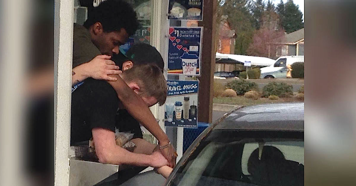 If you’re anything like me, you need an early morning cup of coffee to function throughout the day. I usually make mine at home, but Barbara, a resident of Vancouver, Washington, loves to drive to her favorite coffee shop. Dutch Brothers Coffee is a small, regional chain with locations throughout the Pacific coast. Usually, trips to Dutch Brothers are quick and efficient – but one morning, Barbara noticed the drive-thru line was taking a long time. She saw an employee talking to the woman in front of her in line. Then, more employees gathered at the window and began to lean toward the woman’s car while reaching for her hand. Barbara was stunned by what she was seeing, so she took out her phone and snapped a picture. After a little while, the car drove away and Barbara pulled up, determined to learn the story of what had just happened. When she learned why the Dutch Brothers employees had taken the hand of the women in front of her, she was so amazed and moved that she took to Facebook to share her experience. “Snapped this picture while waiting in line at the Dutch Bros on 138th Avenue today,” Barbara said on Facebook. Dutch Bros. Coffee “Turns out the young lady in line ahead of us lost her 37-year-old husband last night.” Barbara Danner “When the DB guys & gals noticed she was falling apart, they stopped everything and prayed with her for several minutes, invited her to come back for prayer and support, as well as anything else that she might need. Prayers for the young family, and you know where to stop for coffee!” Barbara Danner The touching story has been shared on Facebook over 90,000 times, and people from all over the world have shown appreciation for the thoughtfulness and love displayed by these three employees. These kind of caring acts are not unusual for Dutch Brothers Coffee, as they are currently running a campaign to raise money for the family of an officer who was killed in the line of duty. You can learn more about their charitable acts by watching the video below. H/T: KCRA News | LittleThings Read more: http://www.wimp.com/dutch-brothers-drive-thru/