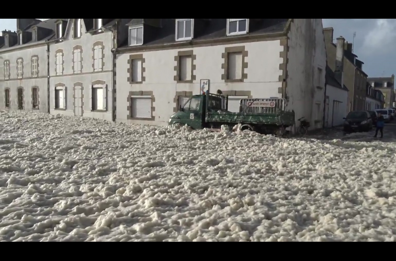 Located on the western coast of France is the tiny commune of Penmarch. With less than 6,000 residents, it’s everything you would expect a quaint, historic French town to be – usually. As you’ll see in this video, what’s happening in the streets of Penmarch this week is less charming and more like being stuck inside a giant, unstoppable washing machine. While the phenomenon looks like an explosion of soap suds, the explanation is actually quite simple. Penmarch is located on flat ground, at a particularly low altitude. Some marshland areas have even been filled in over the years to give way to more inhabitants and commerce opportunities. The port of Saint-Guénolé, where this very clip was taken, is known to be a dangerous place in rough weather, despite protection from two granite peninsulas known as Krugen and Conq. With a choppy ocean nearby, it only makes sense that high winds would bring ashore sea foam … lots and lots and lots of sea foam, as it turns out. Although the person who took this video doesn’t seem to be in any immediate danger, it’s important to note that the ocean, especially coupled with strong winds, can be unpredictable. It’s no wonder that bystanders can be seen recording the incredible sight, but when it comes to forces of nature, it’s usually best to err on the side of caution. That being said, we are glad we were able to witness something so rare and strangely beautiful. It showed us a side of France that we never knew existed. Read more: http://www.wimp.com/sea-foam-beachfront-penmarch-france/