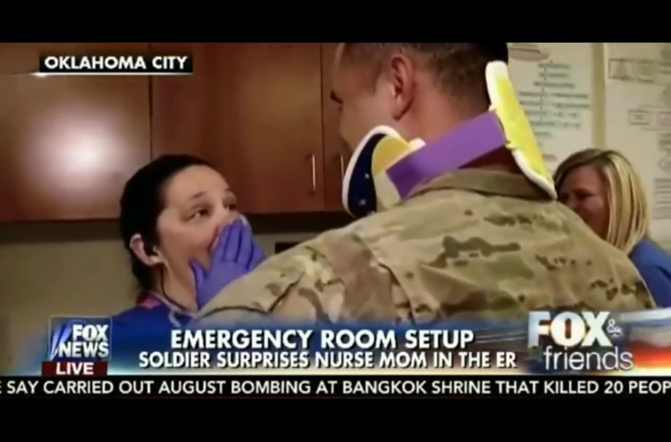 Last Thursday, millions of people celebrated Thanksgiving and reconnected with family near and far. For those of us with family members who live close by, it’s easy to take these holidays for granted. We’ve fallen into a rhythm year after year where we see the same people, eat the same food and crack the same old jokes. Some families, however, have members whose location prevents them from joining everyone else. This, unfortunately, was nurse Tammy Smith’s reality for the past two years. Her son Brandon has been away serving in the military, leaving an empty seat at all family gatherings. Tammy and her husband had no idea that their Thanksgiving was about to change in a big way when one young man with a familiar name showed up in the ER. Read more: http://www.wimp.com/soldier-surprises-nurse-mother-tammy-smith/