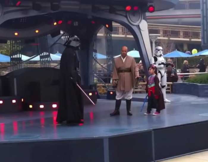 At the end of the Jedi Academy experience at Disneyland, kids are given the choice of either joining the dark side or fighting Darth Vader. Most children choose to take on the powerful sith lord, but this little girl had other plans… Read more: http://www.wimp.com/little-girl-joins-the-dark-side/