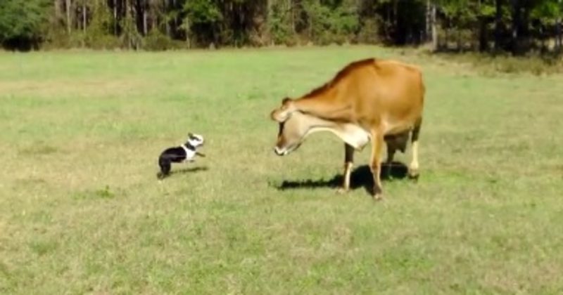 What do you suppose a dog thinks when they see a cow? “That’s the ugliest dog I’ve ever seen”? Or perhaps, “I’m going to make her my new best friend”? Miss Piggie the Boston Terrier could hardly contain her excitement when she met Suzanne, a dairy cow. At first, no one knew how the larger animal would react to the little pup. Within minutes, though, it became clear that they just wanted to be friends. Watch as Miss Piggie and Suzanne have their very first playdate. It looks like they’ll have many more fun days ahead! They’re very different animals, but dogs and cows have been known to be thick as thieves. Some cows treat dogs like their babies. Read more: http://www.viralnova.com/dog-and-cow/