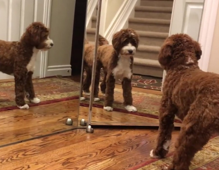 It’s okay dog, sometimes we get freaked out when we see ourselves in the mirror too. Read more: http://www.wimp.com/labradoodle-sees-herself-in-the-mirror-and-just-cannot-deal/