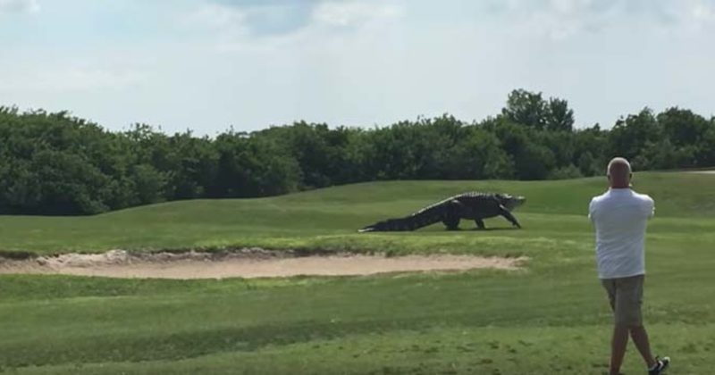 If there’s one place you don’t want to run across a giant, 15-foot alligator, it’s on a beautiful golf course in sunny Florida. Sadly (or awesomely, depending on your feelings about alligators), that’s exactly what happened at Buffalo Creek Golf Course in Palmetto, Florida, yesterday afternoon. Golfer Charles Helms and a friend were enjoying a beautiful day out on the green when the massive reptile made a chilling appearance. Helms was so shocked by the creature’s size that he was convinced that it had to be a prank of some sort. And when you see this footage, you probably won’t believe your eyes either. (via The Guardian) Apparently, this massive gator is seen fairly regularly around Buffalo Creek. One employee even refers to it as the unofficial mascot of the golf course! Read more: http://www.viralnova.com/golf-gator/