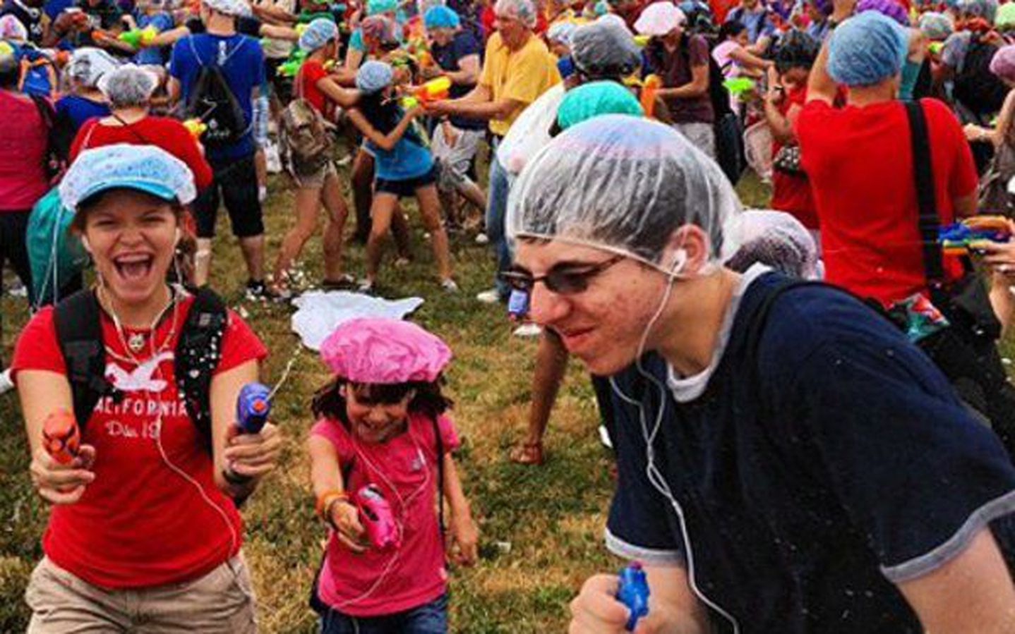Improv Everywhere’s MP3 experiment is a public participatory event that’s a mix of scavenger hunt and flash mob. Everyone downloads an original MP3, then meets at a specific location and acts casual until it’s time to push play — followed by 45 minutes of syncronized, hilarious antics that leave unsuspecting visitors simultaneously confused and entertained. This year, there were 4,000 participants, 300 of whom didn’t even make it to the meeting place — Governor’s Island in New York City — because too many people were trying to get there. Instead, they followed instructions in Battery Park. Watch what happens when two armies of thousands go head-to-head in the most epic water gun fight. Instagram Coverage of the MP3 Experiment 1. Diehard Participants People stuck in long lines didn’t let location keep them from participating — many followed instructions from the ferry. Image courtesy of VivereNewYork 2. Victory Capes Participants flocked to the parade grounds with white sheets draped over their shoulders. Image courtesy of itschiefy 3. Tower Challenge Small groups were challenged to create the tallest tower using hard, flat objects. Image courtesy of justsamuelk 4. Improv Everywhere App Improv Everywhere used its free iOS app to help sync mobile devices to the exact second. Image courtesy of qympanzer 5. Marching to Battle Donning shower caps, both teams took 50 paces toward each other, with water guns held high in the air. Image courtesy of leigh1029 6. Drone Camera It’s a bird, it’s a plane…it’s a hexacopter drone used to capture footage from the air. 7. Founder Charlie Todd Improv Everywhere founder Charlie Todd with wife and senior IE member Cody Lindquist. Image courtesy of Cody Lindquist 8. Ferry The ferry leaving Governors Island swarmed with people. Image courtesy of jqj3 Read more: http://mashable.com/2012/07/30/water-guns/