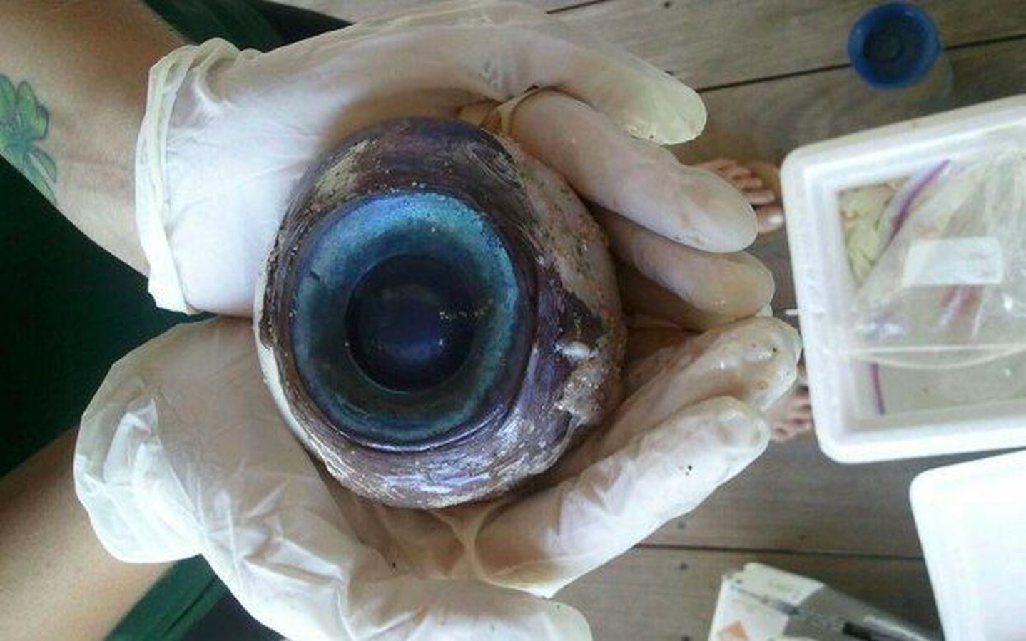 A softball-size eyeball washed ashore on Pompano Beach, Fla. this week and it has experts perplexed. Is a colossal squid lurking in the ocean’s depths with an eye patch or did a whale’s Halloween gag go too far? No one knows for certain, but the Florida Fish and Wildlife Conservation Commission has fielded plenty of odd guesses since sharing the photo on its Facebook page. The whopper peeper is currently chilling on ice as it awaits shipment to the the Florida Fish and Wildlife Research Institute in St. Petersburg, where it will be analyzed and, hopefully, identified. While we wait for marine biologists to do their thing, we can’t help but hope that monstrous orb evolves into a eye-themed meme of Steve Buscemi proportions. A little more eyeball oddness for your viewing pleasure: Top image courtesy of Carli Segelson / Florida Fish and Wildlife Conservation Commission Read more: http://mashable.com/2012/10/12/giant-eyeball-mystery/